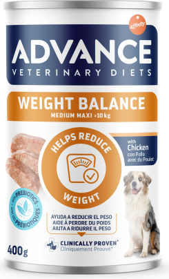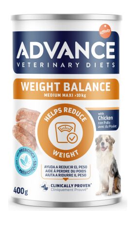 | ADVANCE VETERINARY DIET DOG Weight Balance Med/Maxi 400g ir pilnvērtīga, sabalansēta mitrā diētiskā barība, kas īpaši izstrādāta, lai samazinātu lieko ķermeņa svaru pieaugušiem vidēja un liela auguma suņiem (virs 10 kg). Tās klīniski pārbaudītā formula apvieno samazinātu enerģētisko vērtību ar augstu olbaltumvielu un šķiedrvielu saturu, veicinot drošu un efektīvu svara zudumu, saglabājot muskuļu masu un radot sāta sajūtu. Sastāvdaļas: Gaļa un blakusprodukti (vista 60%), graudaugi, augu blakusprodukti (fruktooligosaharīdi 0,15%), minerālvielas, eļļas un tauki. Piedevas: Uzturvērtība: D3 vitamīns 200 SV, E vitamīns 20 mg, L-karnitīns 100 mg, 3b202 (I: 0,75 mg), 3b405 (Cu: 1,75 mg), 3b503 (Mn: 1,4 mg), 3b605 (Zn: 25 mg).  |