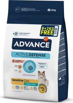 | ADVANCE CAT STERILIZED SENSITIVE CARE SALMON 8+2kg - pilnvērtīga sausā barība pieaugušiem sterilizētiem kaķiem no 1 līdz 10 gadiem, ar jūtīgu gremošanas sistēmu. Ar lasi.