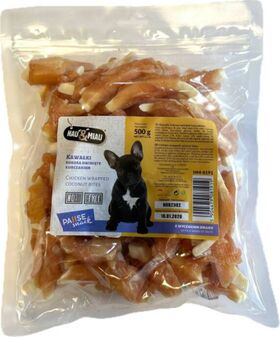 Hau Miau suņu kārums 500g - vistas gaļā ietīti kokosriekstu gabaliņi. Bez glutēna Sastāvdaļas: kokosrieksts 51%, vistas gaļa 45%, kukurūzas ciete, glicerīns, sorbīts, sāls, tehnoloģiskās piedevas: konservanti Analītiskās sastāvdaļas: kopproteīns 26%, koptauki 2,2%, kopšķiedra 2,5%, koppelni 3%, mitrums 21% Iepakojums: 500g (iepakojums ar rāvējslēdzēja aizdari, kas nodrošina ilgāku svaigumu)