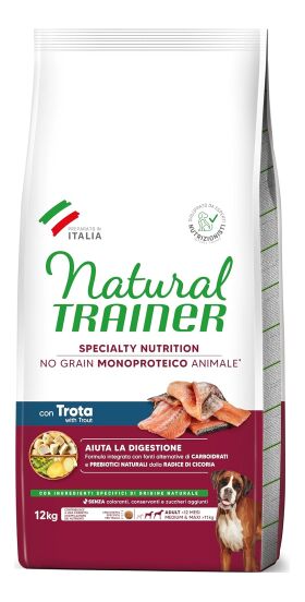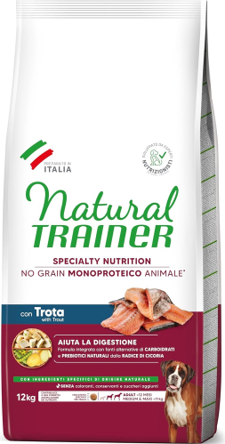 NATURAL TRAINER DOG NO GRAIN MONOPROTEICO ANIMALE ADULT MEDIUM/MAXI TROUT 12 KG - pilnvērtīga un sabalansēta barība pieaugušiem vidēja un liela izmēra suņiem (>11 kg)