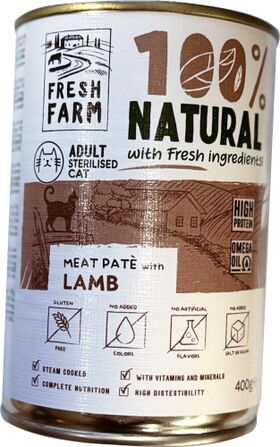 | PREFERA Fresh Farm CAT Smooth pate with lamb 400 gr - pilnvērtīga barība kaķiem, pastētes veida konservi kaķiem, ar jēra gaļu. SASTĀVS: dzīvnieku izcelsmes produkti 96,5% (tai skaitā jēra gaļa 15%), rīsi, laša eļļa, vitamīni un minerālvielas. Uzturvērtības piedevas: A vitamīns (3a672a) 4000 SV, D3 vitamīns (3a671) 300 SV; E vitamīns (3a700) 150 mg; holīna hlorīds 500 mg, cinks (3b605) 30mg, mangāns 5mg, DL-metionīns 1500mg, taurīns 800 mg; L-karnitīns 50 mg. ANALĪTISKĀS SASTĀVDAĻAS: kopproteīns 12%, koptauki 3%, kopsķiedras 1%, koppelni 2%, mitrums 80% |